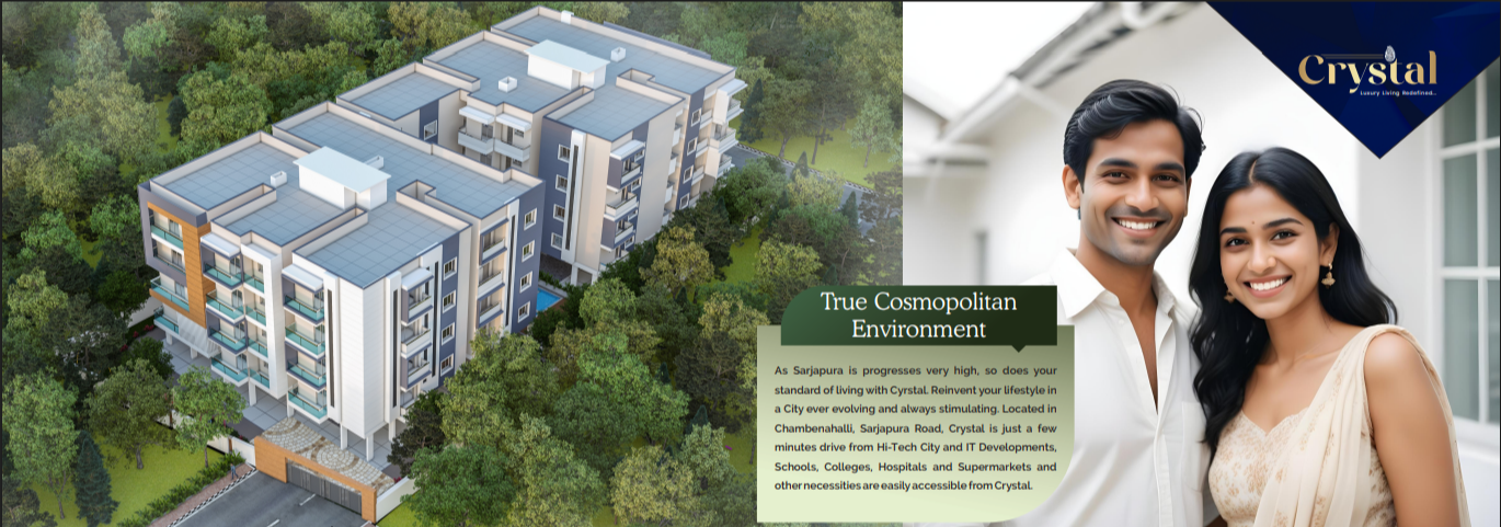 Crystal Apartments offers 2 & 3 BHK luxurious homes with 100% Vaastu, no common walls, and world-class amenities. Approved by BMRDA & RERA, Crystal is located behind Confident Oxygen Mall, Sarjapur Road, in the heart of IT hubs, schools, and hospitals.
